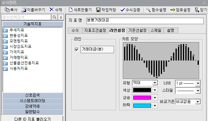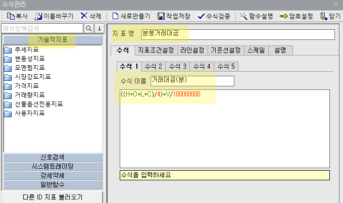 2.수식관리자창에 수식을 적어 줍니다. (기술적지표-지표명-수식이름)