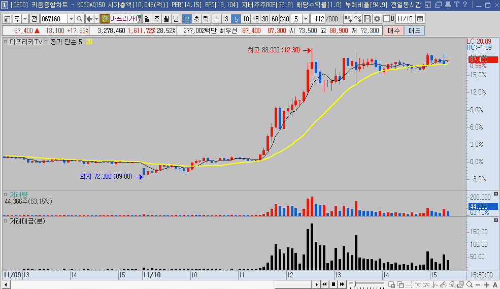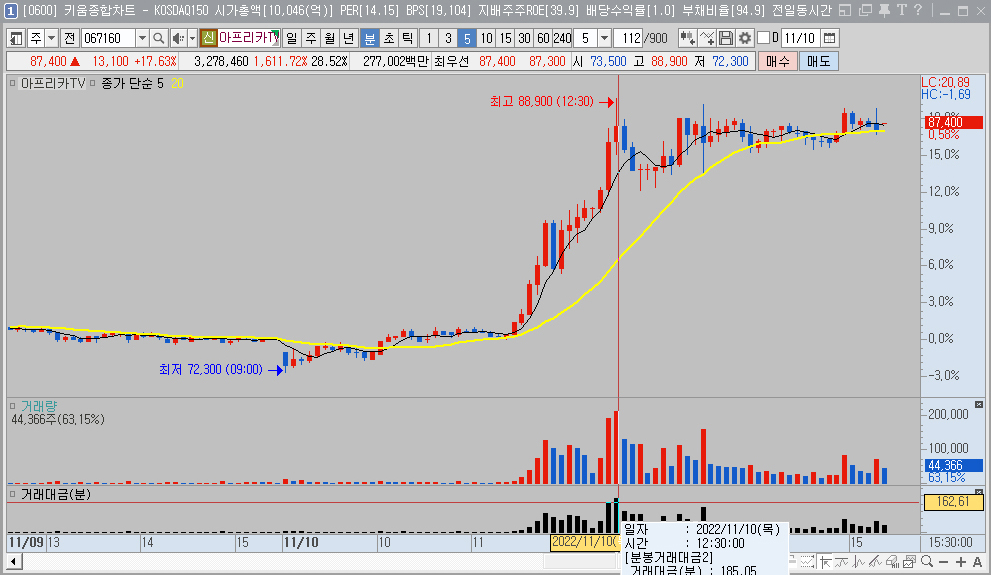 아래의 5분봉 차트에서 거래량이 가장 많이 터졌을때의 봉에 마우스를 이동해 보면 185억이 터졌다는 걸 쉽게 확인할 수 있습니다.