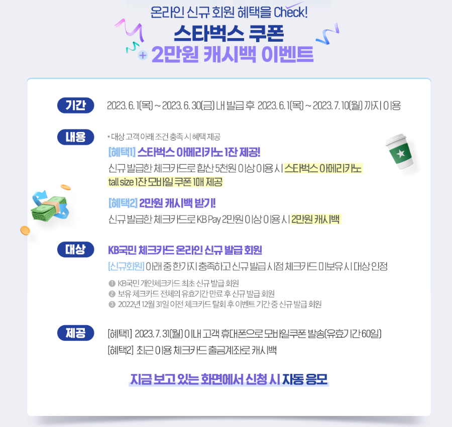 행사 기간 중 KB 노리2체크카드를 발급 받고 5천원 이상을 이용시 스타벅스 모바일쿠폰 1매를 드립니다.
