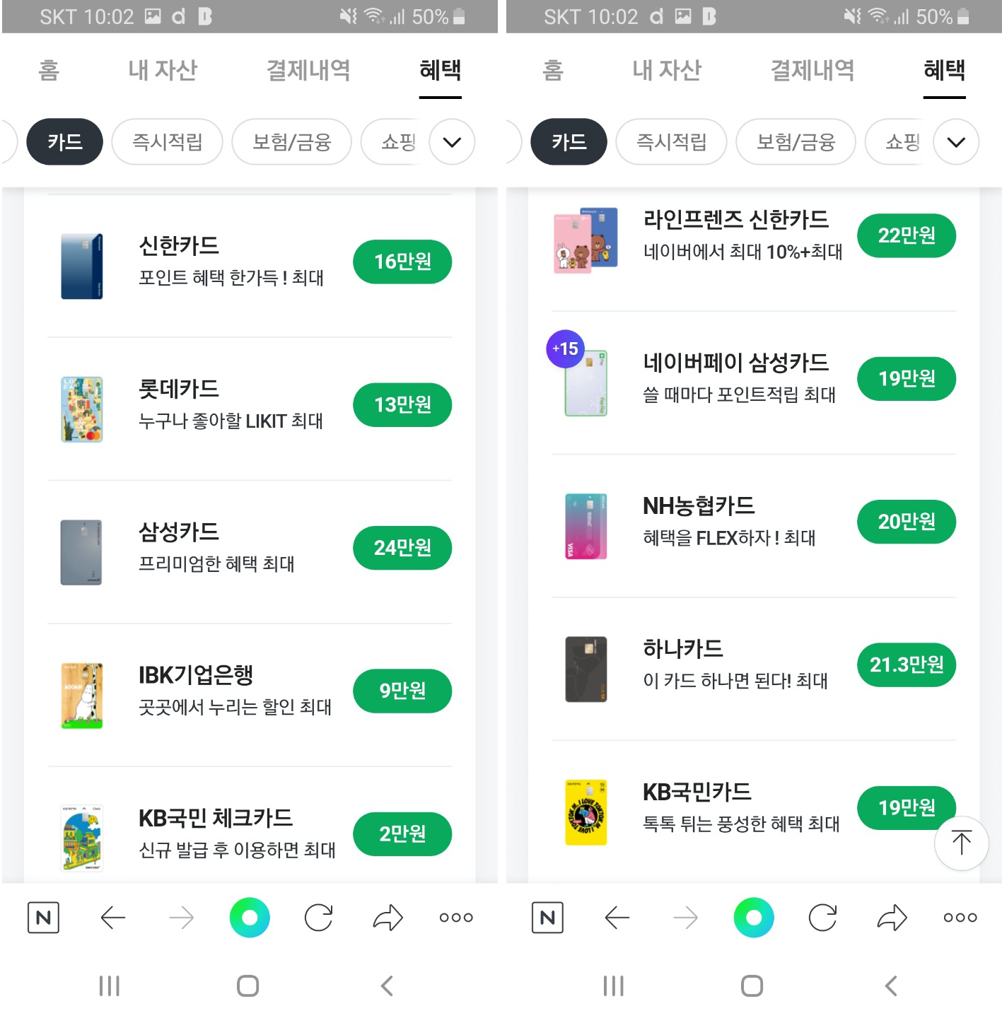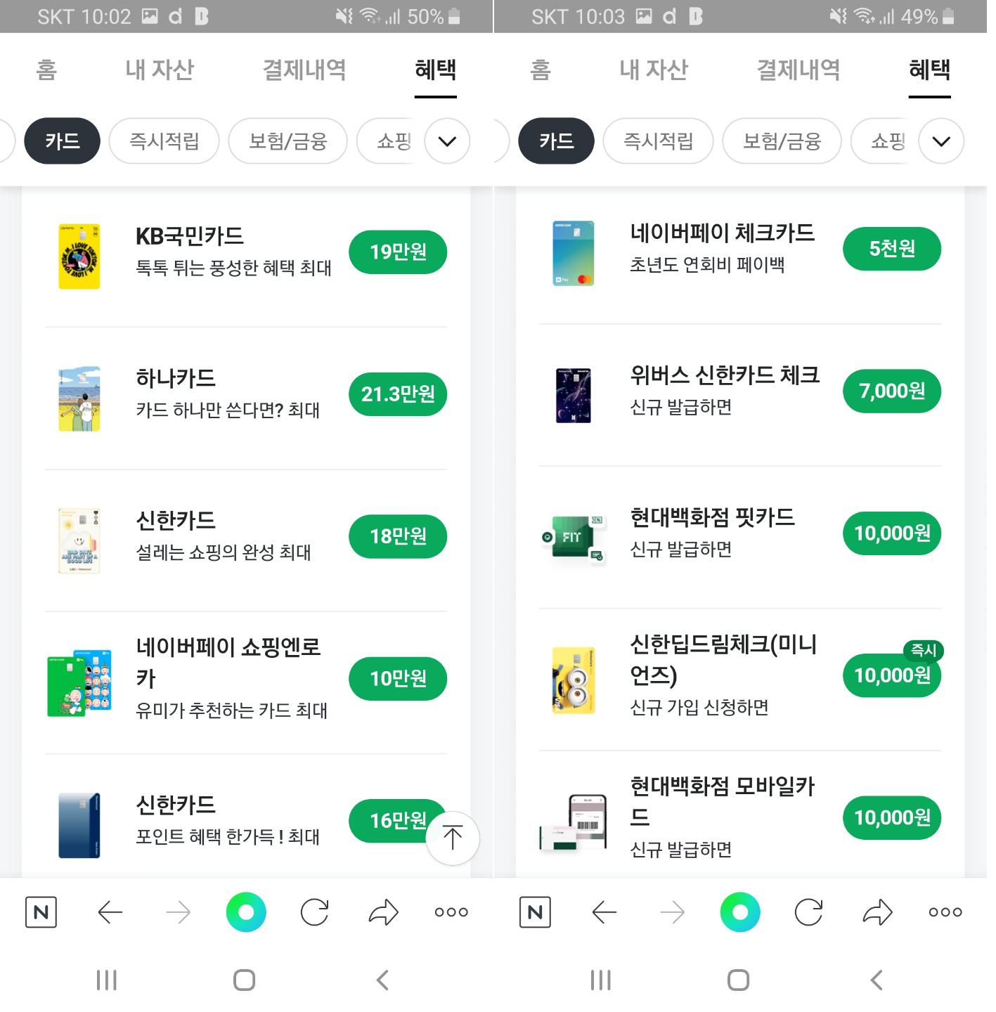 네이버페이 내 "혜택" 메뉴에 보시면 신용카드 발급 시 포인트로 적립해 주는 카드의 목록이 있습니다.