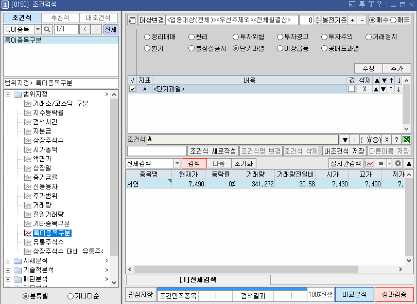 제가 사용하는 방법은 2가지인데 아래의 링크에서 확인하거나 HTS의 검색식에서 "특이종목:으로 검색 후 단기과열 선택하여 검색이 가능합니다.
