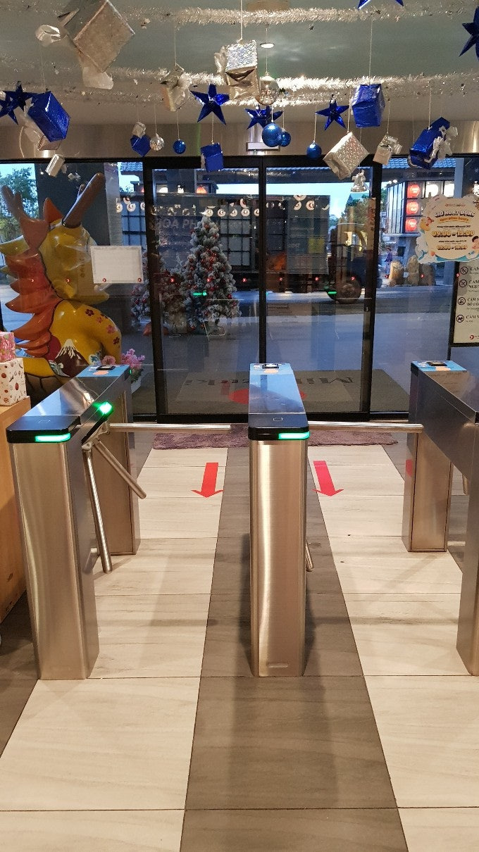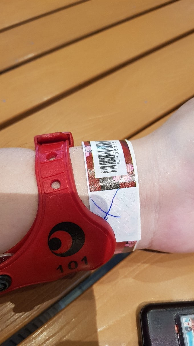 아동은 파란색 어른은 빨간색 띠를 주는데 손목에 차시면 됩니다. 바코드를 스캔하여 입실합니다.