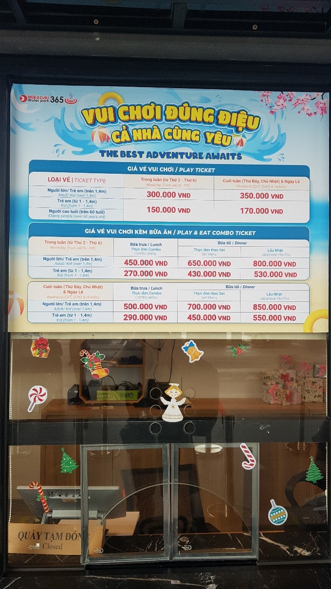 평일가격 성인 30만동 어린이 15만동이며 , 성인2명과 어린이 1명 구매하고 어린이 1명은 무료입장하였습니다.