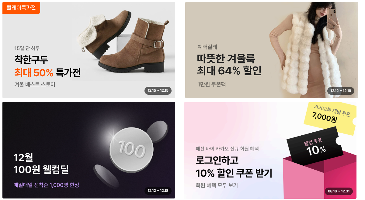 이젠 패션도 카카오에서! 지금 패션바이카카오에서 인기 있고 세련된 패션 아이템들을 만나보세요. 저렴한 가격은 기본이죠! [패션을 넘어 나를 찾는 패션바이카카오] ● 내 취향의 아이템을